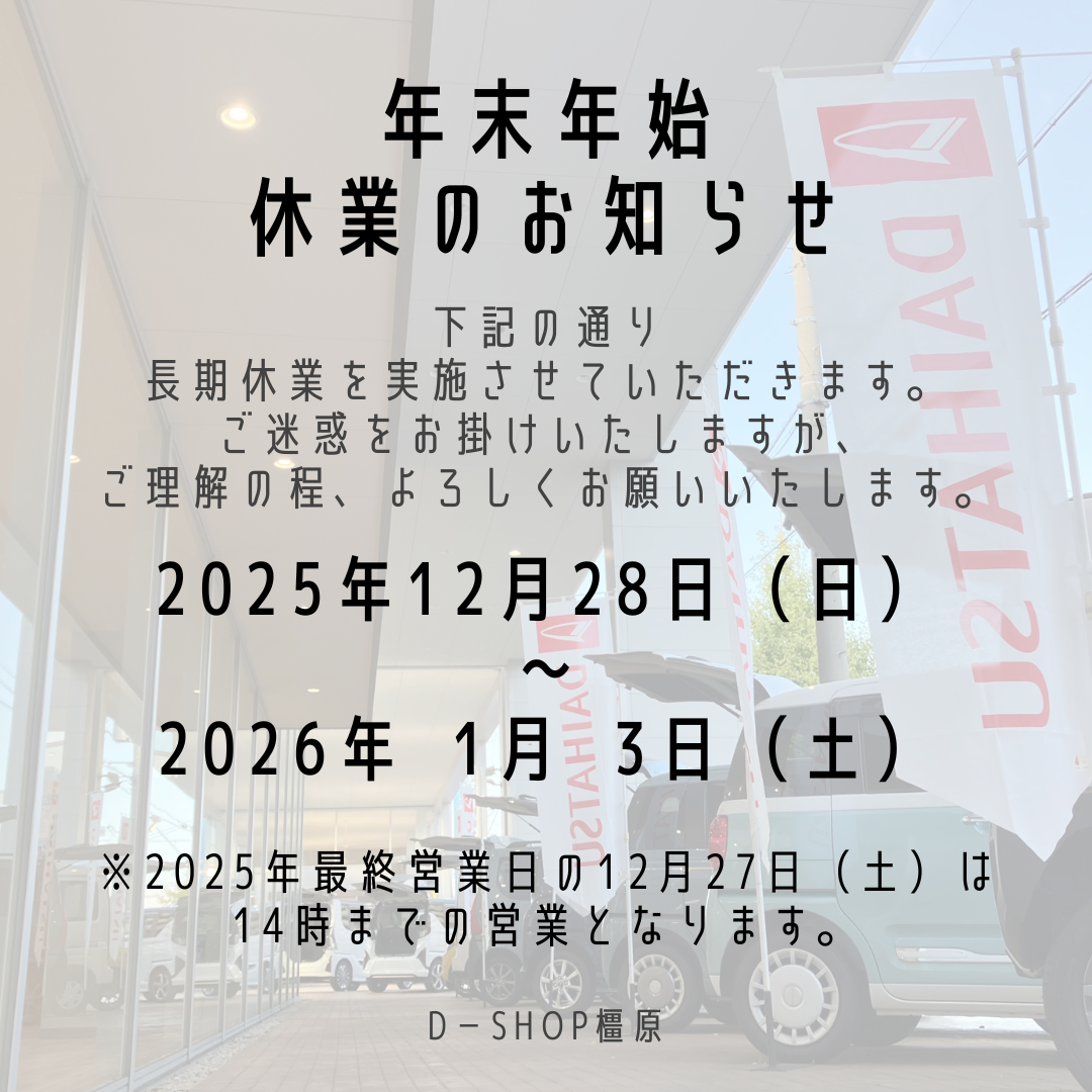 年末年始休業のお知らせ・D-shop橿原|月々1.1万円で新車に乗れるマイカーリース「D-shop橿原」
